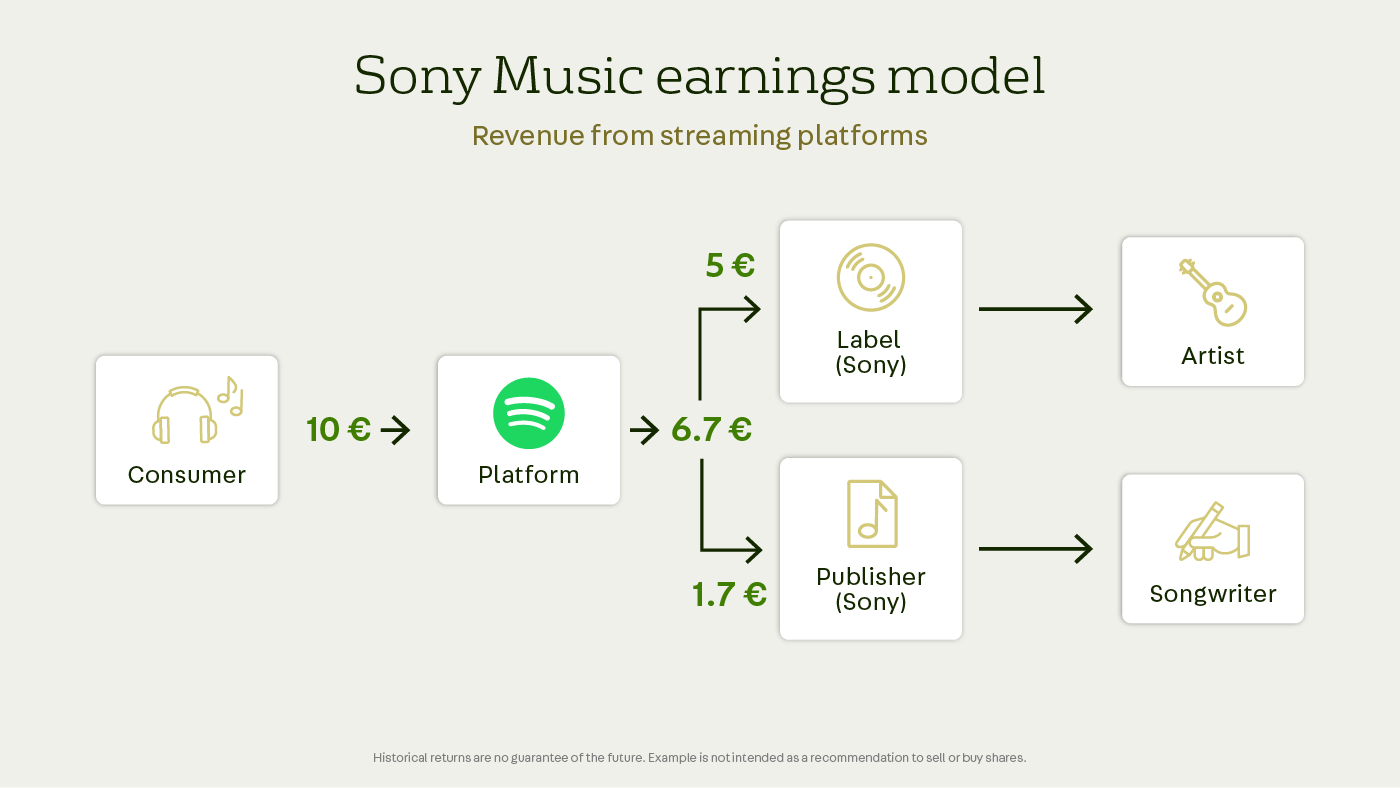 As can be seen in the picture, for every €10 that we consumers pay Spotify or other streaming platforms, the label and publishing company – that is, Sony Music – capture roughly 2/3 of that revenue.