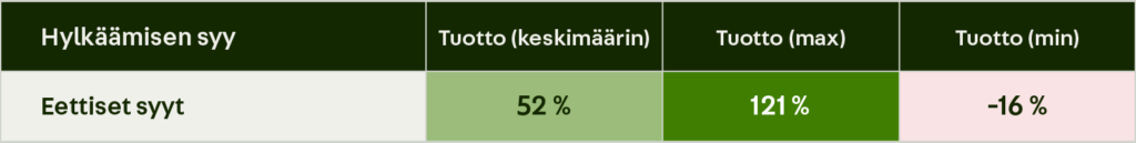 Ensinnäkin, hylkäsimme laadukkaan oloisia yhtiöitä eettisistä syistä. Nämä eivät olleet siis perinteisiä ESG-mittareiden vastaisia yhtiöitä. Hylkäsimme esimerkiksi erittäin harvinaiseen sairauteen liittyvän lääkevalmistusyhtiön, nimeltä Vertex Pharmaceuticals. Ajattelimme, onko oikein laskuttaa satojatuhansia dollareita vuodessa, jotta ihminen pysyy terveenä tai ei kuole.