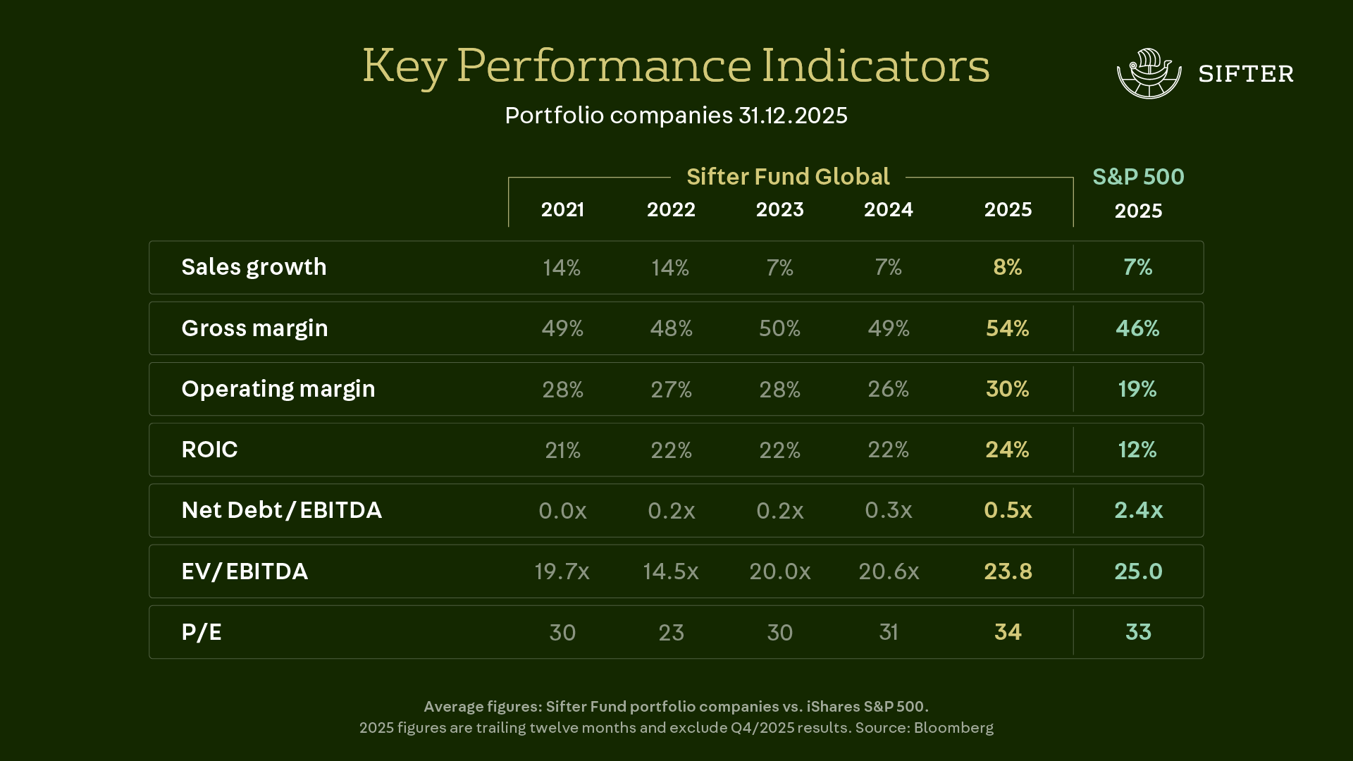 Kuten taulukosta näkyy, Sifter-rahaston salkkuyhtiöiden liiketoiminnan laatu on pysynyt vahvana ja tasaisena vuodesta toiseen. Erot S&P 500 -yhtiöihin nähden näkyvät erityisesti kannattavuudessa, pääoman tehokkaassa käytössä ja taseiden vahvuudessa.