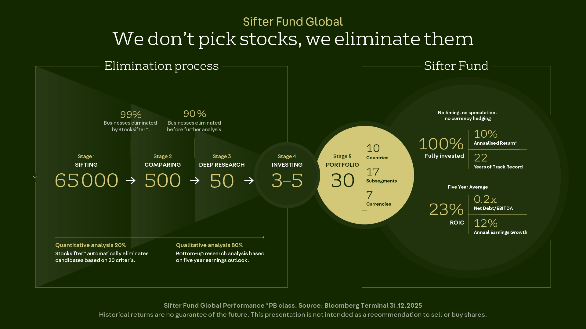 Sifter-rahaston sijoittajat saavat toimivaksi havaitun sijoitusmenetelmän sekä globaalisti hajautetun salkun tarkasti valittuja laatuyhtiöitä.