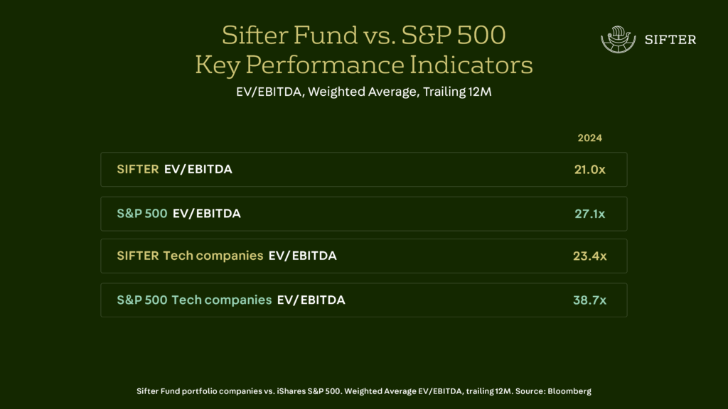 Kun vertaamme Sifter-salkun painotettua keskiarvoa S&P 500 -indeksiin, huomaamme, että S&P 500 on noin 30 % kalliimpi kuin Sifter-rahasto (viimeiset 12 kk, painotettu keskiarvo).