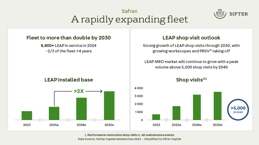 Safran tunnetaan sen valmistamista Leap-moottoreista, jotka ovat saavuttaneet lähes monopoliaseman kapearunkoisissa Airbus ja Boeing -lentokoneissa. Kasvua on luvassa, sillä lentokoneiden määrän odotetaan tuplaantuvan vuoteen 2040 mennessä.