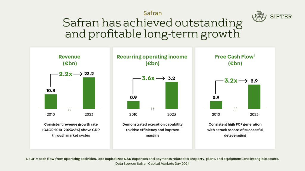 Safran on erinomainen esimerkki Sifter-salkun laatuyhtiöstä, jolla on selkeitä kilpailuetuja ja vahva liiketoimintamalli. Yhtiö toimii kasvavalla toimialalla ja sillä on ennustettavat tulovirrat.