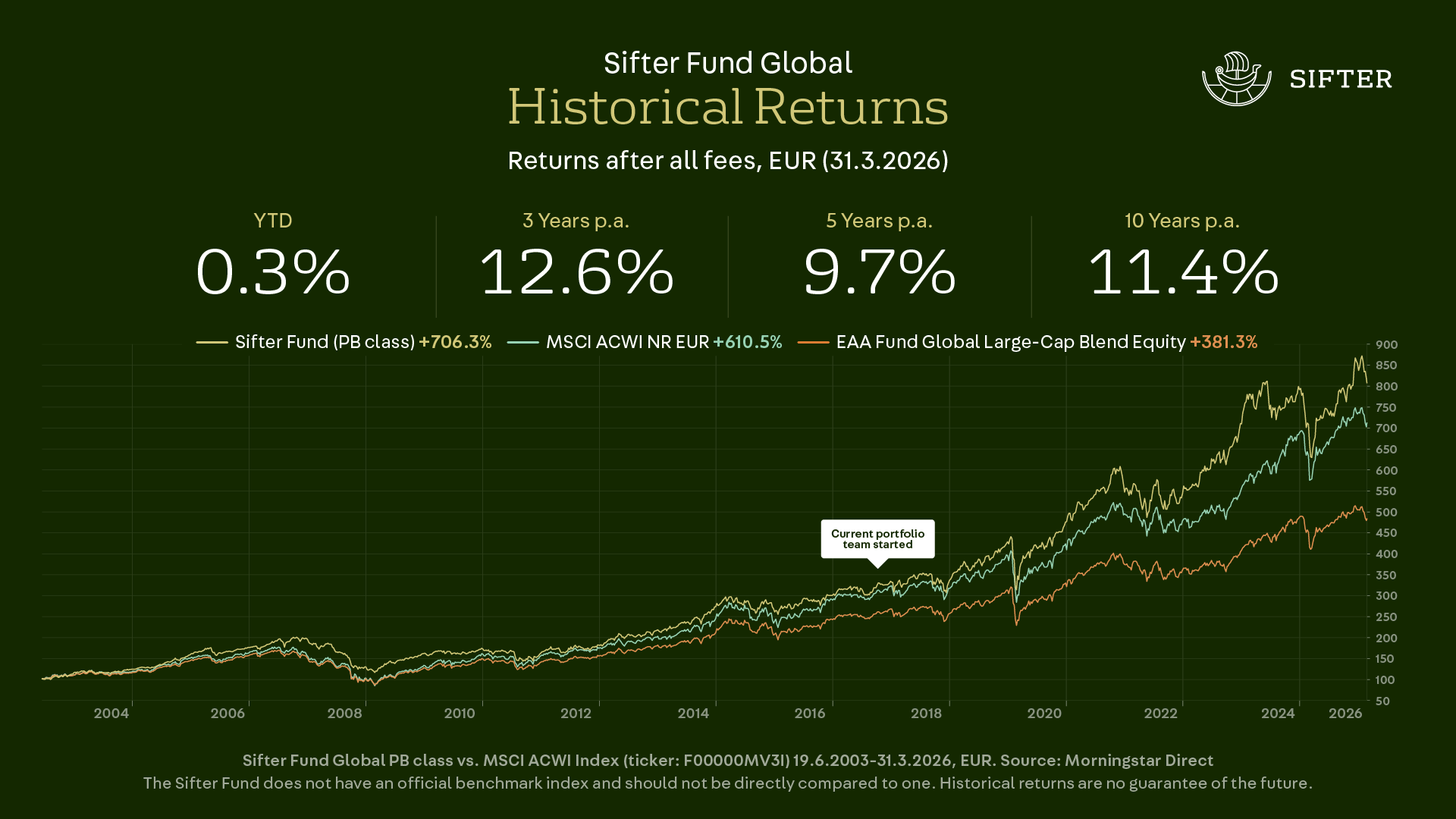 23 vuoden historiassa Sifter-rahasto on tuottanut 710 % (PB-luokka) kulujen jälkeen. Rahaston tuotto on 105 prosenttiyksikköä enemmän kuin maailman osakeindeksillä (MSCI ACWI) ja selkeästi parempi, kuin verrokkiryhmän rahastoilla keskimäärin (EAA Fund Global Large-Cap Blend Equity).