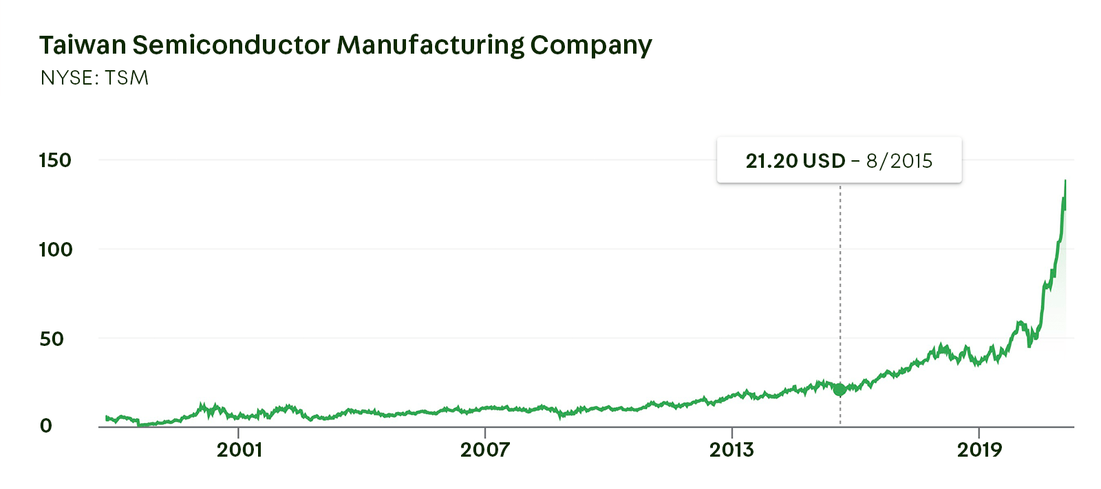 Sifter-rahasto sijoitti TSMC-yhtiöön 8/2015 ja teki lisäsijoituksen 2/2019. Kuvassa osakkeen arvonkehitys viimeiseltä kahdeltakymmeneltä vuodelta.