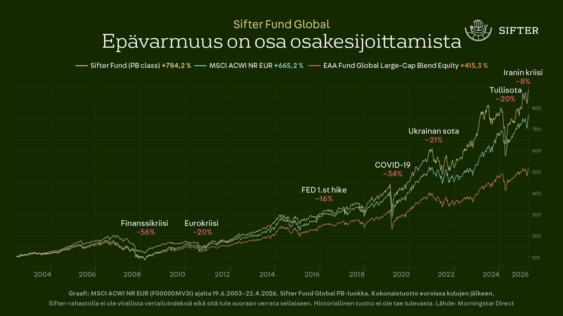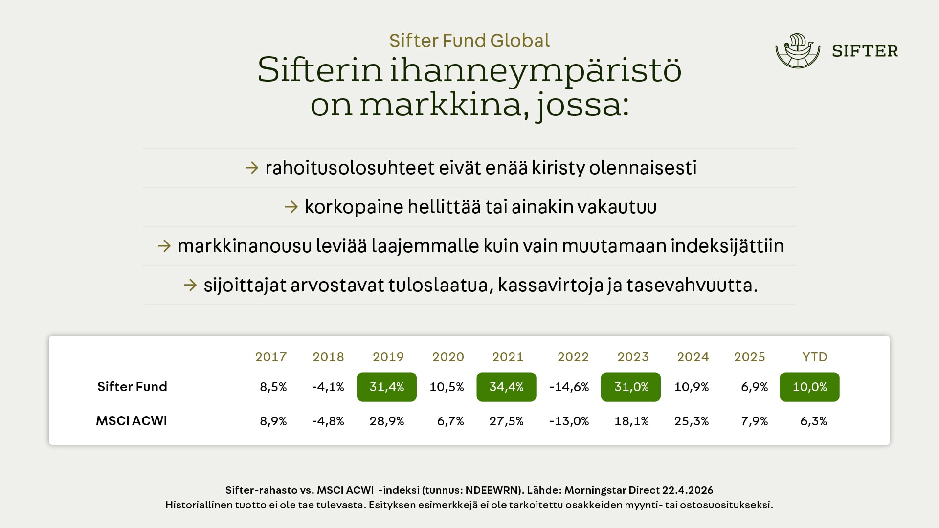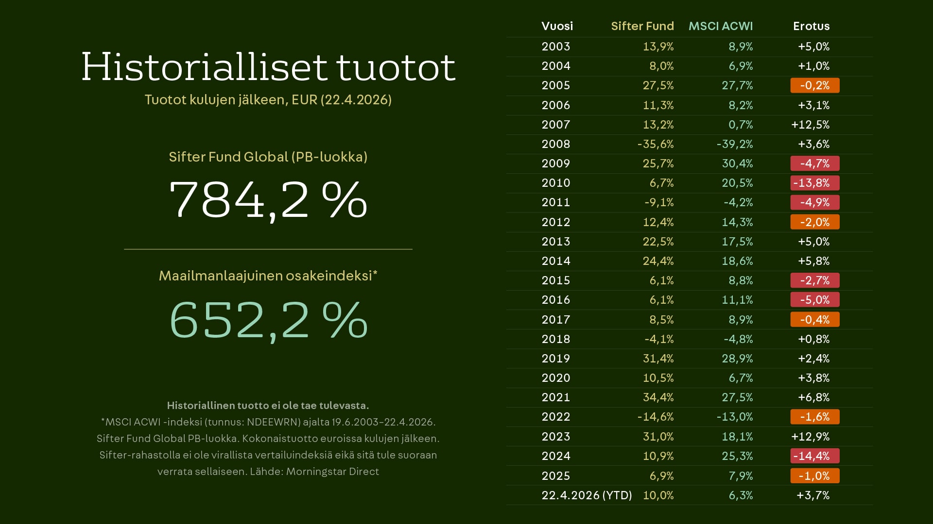 Tilanne on kuitenkin tasaantunut, ja Sifter on noussut noin 11 % vuoden alusta (28.4.2026). Vaikka monista romahduksista on noustu väkevästi ylös, niin on hyvä kuitenkin muistuttaa, että historiallinen tuotto ei ole tae tulevasta.