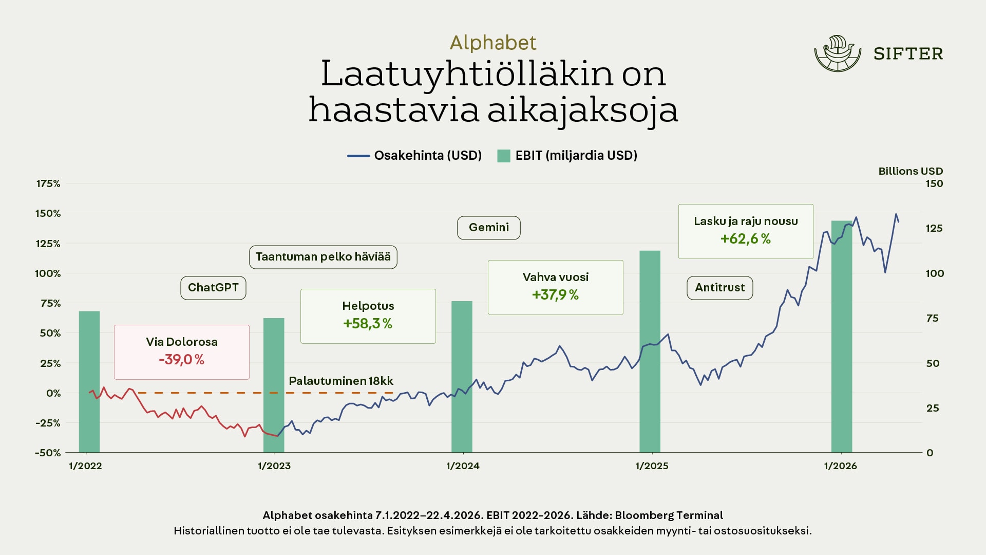 Myös laatuyhtiöille tulee vaimeampia ajanjaksoja. Vuoden 2022 alussa Alphabet näytti laatusijoittajan unelmalta: Google-haku, YouTube, pilvi, vahva tase ja valtava kassavirta.