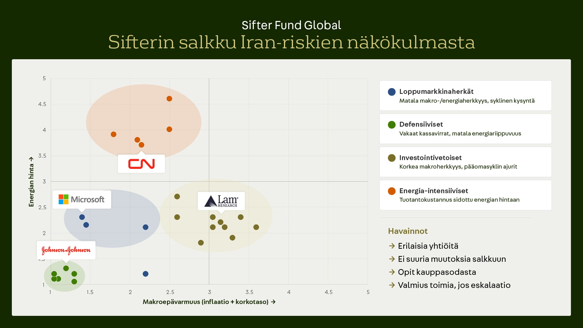 Maaliskuun alussa 2026 sijoitimme Sifter-yhtiöt nelikenttään, jonka akseleina ovat herkkyys energiahinnan nousulle ja herkkyys yleiselle epävarmuudelle.