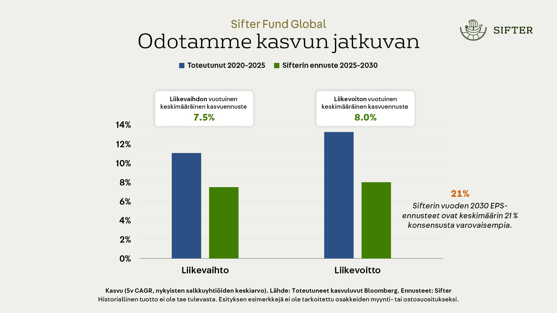 Osakemarkkina katsoo tyypillisesti 6–12 kuukautta eteenpäin – Sifterin strategiassa se on liian lyhyt aikahorisontti. Me katsomme, miltä yhtiön tuloksen pitäisi näyttää viiden vuoden kuluttua. Pidempi horisontti auttaa katsomaan markkinasyklien ja käänteiden yli.