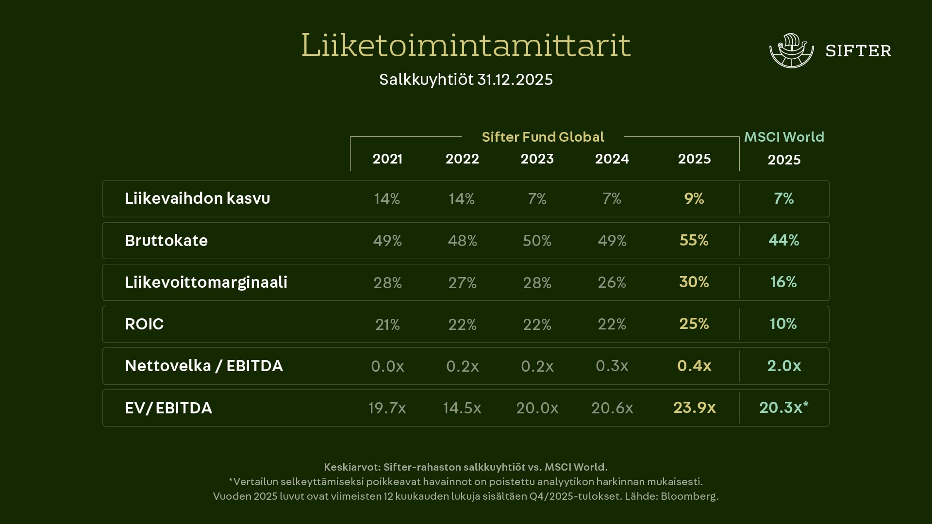Toimialajakoa tärkeämpää on ymmärtää, minkälaisia liiketoiminnan tuloksia yhtiömme tekevät. Vuoden 2025 lukujen pohjalta salkkumme yhtiöiden ROIC on noussut 25 %:iin, bruttomarginaali on 55 %, liikevoittomarginaali 30 %, liikevaihdon kasvu 9 % ja velkaisuus vain 0,4 × käyttökate.