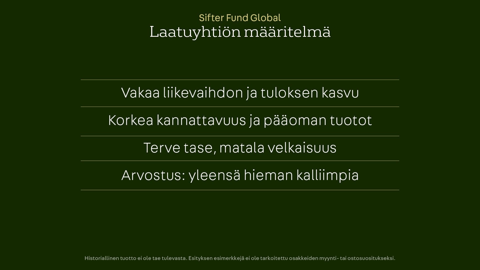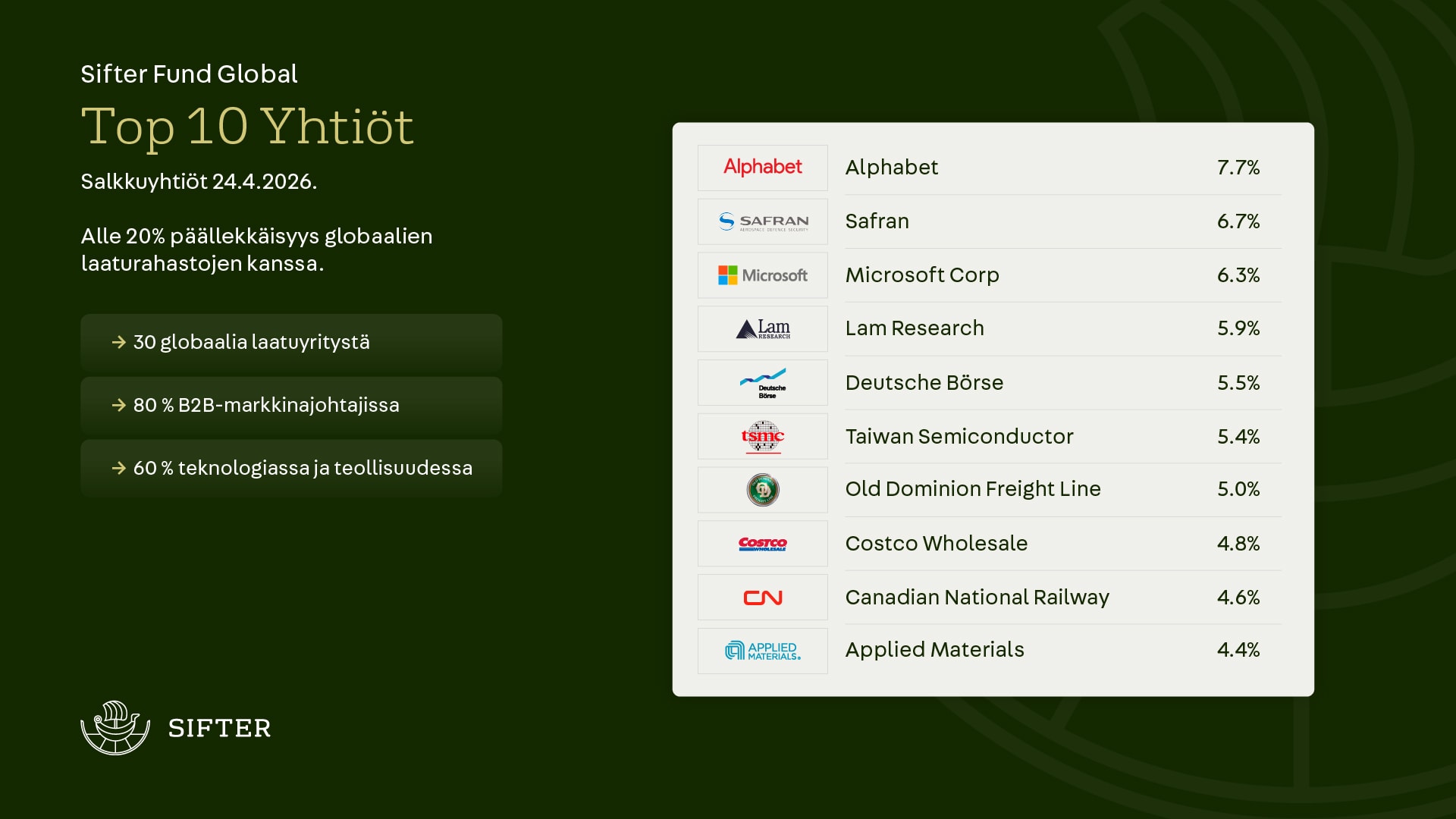 Sifterin tehtävä on omistaa pieni joukko erinomaisia yhtiöitä ja pidättäytyä turhista liikkeistä juuri silloin, kun ne tuntuvat houkuttelevimmilta. Tämä koskee yhtä lailla kriisin pohjia kuin hypevaiheen huippuja.