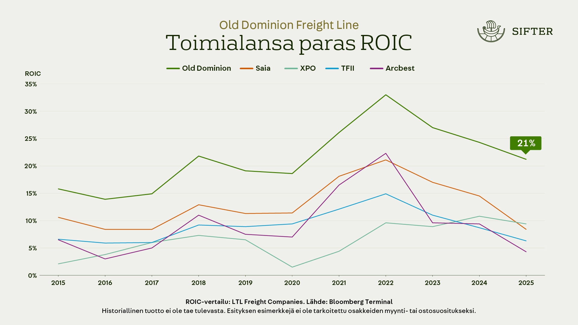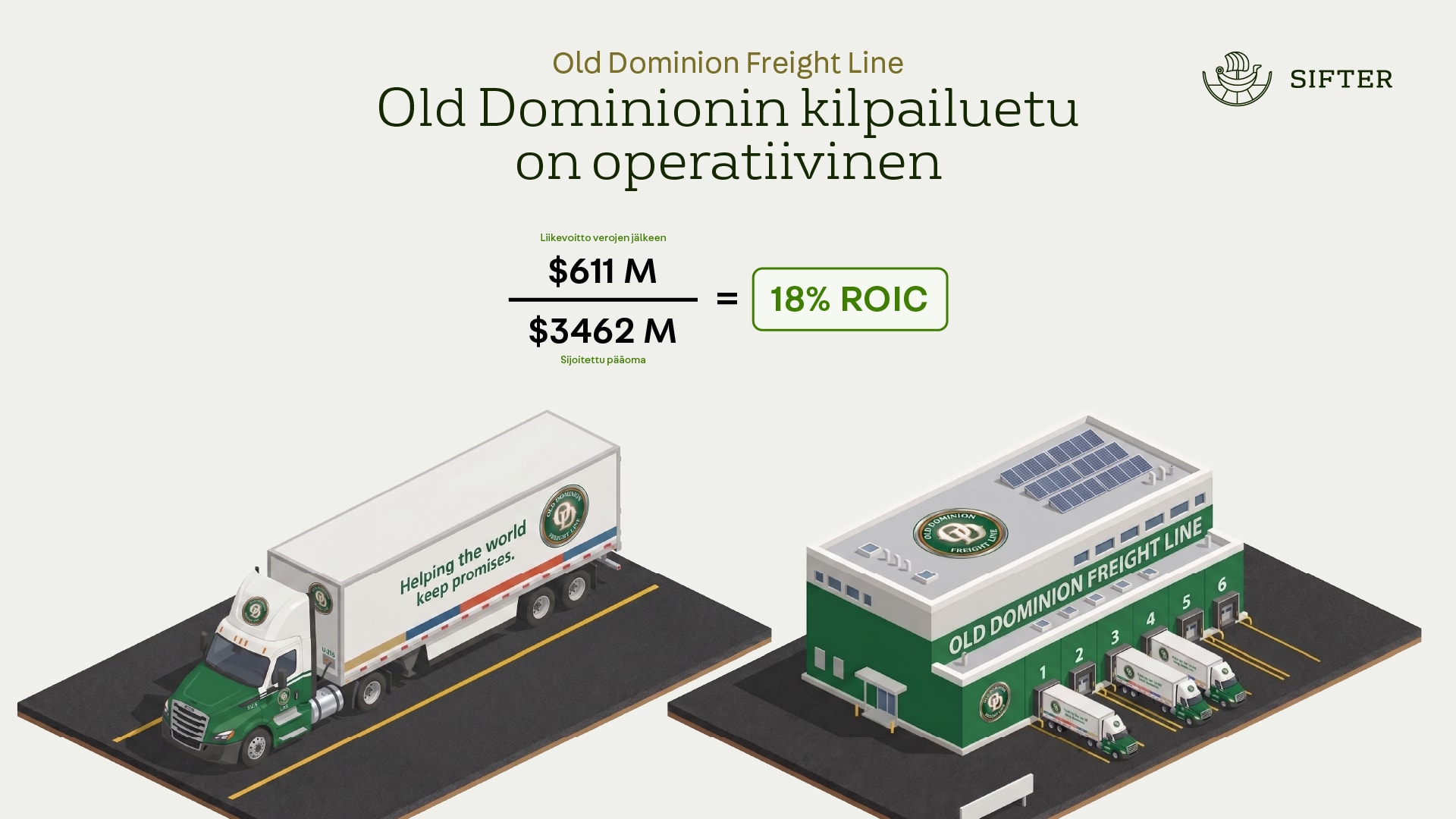 Old Dominionin pääoma on käytännössä kokonaan kiinni terminaaleissa ja rekoissa, ja kuljetusalaa pidetään yleisesti kapeakatteisena ja kovan kilpailun alaisena. Miten yhtiö silti tuottaa näin korkeaa pääoman tuottoa?