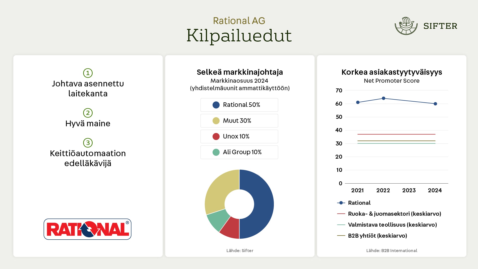 Rationalin liikevaihto ja liikevoitto ovat kasvaneet 7–8 % vuositahtia kymmenen vuoden ajan, bruttomarginaali on 60 % (verrokeilla 40 %), liikevoittomarginaali 25 % ja ROIC noin 30 %. Lisäksi yhtiöllä on vahva nettokassa.
