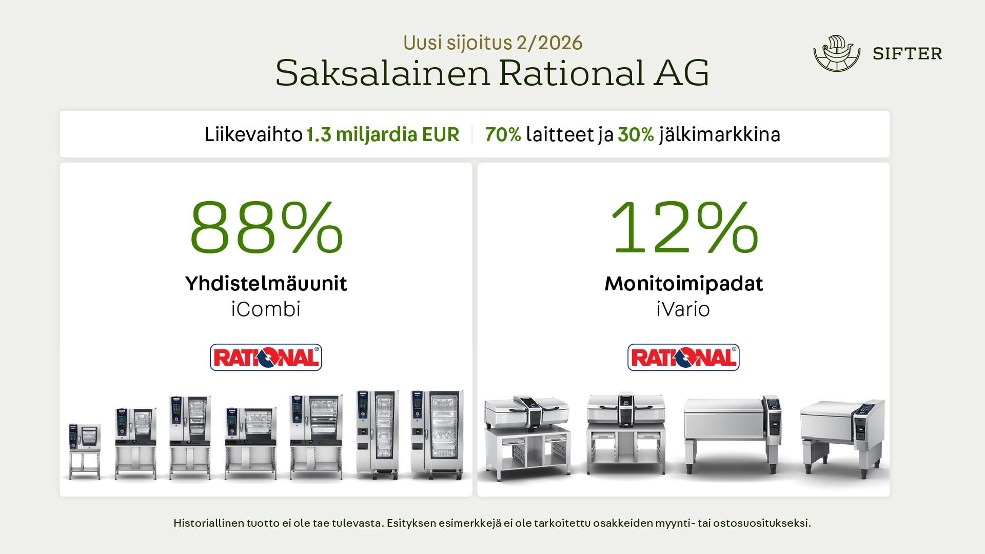 Sijoitimme Rationaliin helmikuussa 2026. Saksalainen yhtiö valmistaa ammattikeittiöiden kypsennyslaitteita, ja sillä on noin 50 %:n globaali markkinaosuus yhdistelmäuuneissa.