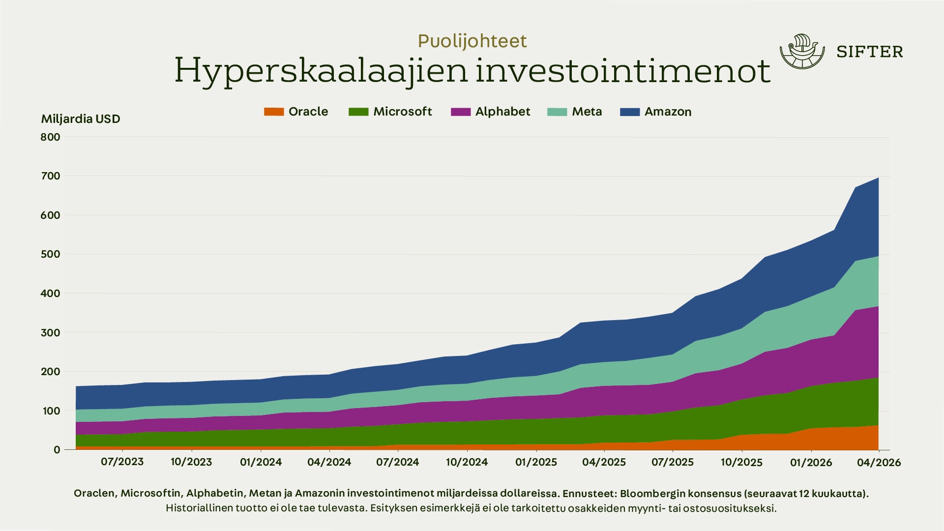 Datakeskusinvestoinnit ovat jatkaneet kasvuaan. Meta, Alphabet ja Amazon ohjeistavat 50–100 %:n nousua vuoden takaisesta.